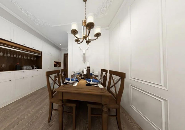 开放式设计的格局中仅以一条地毯巧妙地将客厅与餐厅分割开来,并通过木质元素的餐桌椅与白色的小鹿装饰,界定出用餐区域,赋予空间温馨浪漫的格调与表现力。