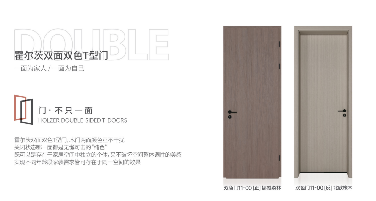双面双色T型门的推出,展现了霍尔茨突破现有木门单一色调局限的勇气,也诠释了霍尔茨独特的色彩美学设计。此前,霍尔茨推出的多款木门都在色彩搭配上下足了功夫,例如“龙女”借鉴了化妆界彩妆大牌“NARS”的当家产品;“斑马先生”将黑与白的经典组合运用于家居空间;WOOD(木及)系列则还原了木材的天然本色等等,更加符合年轻化的潮流趋势。
