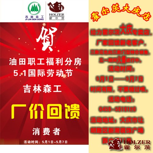 给力霍尔茨大庆专卖店,厂家回馈新老客户,三款花色的三款门型特价销售,五一期间火爆进行中。 活动时间:5月1日——5月7日,时间有限,不要错过哦 活动电话:0459-5919126 活动地址:大庆市让胡路区新潮装饰广场西广场17号