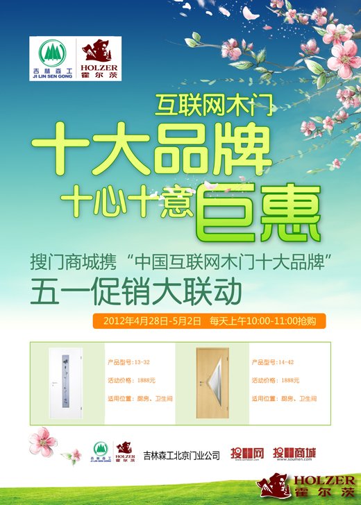 五一长假是消费者的黄金期,正时冬去春来,每个家庭也都开始考虑重新装点自己温馨的家。值此之时,霍尔茨携手搜门网络商城,在全国范围内,一起推出活动“强强联手,网络商城强势特价”来满足消费者的购买需求,让广大消费者足不出户,便可在网上获得更大的优惠。 活动地址:http://zhuanti.sortdoor.com/wuyiliandong/