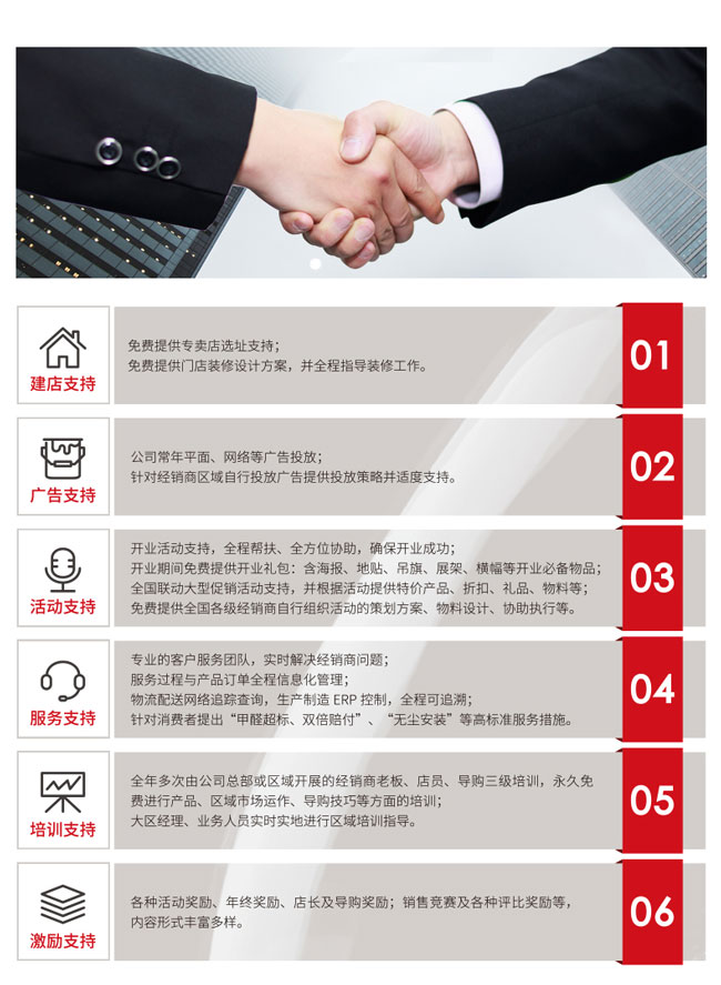 除了在体系建设、品牌实力、产品优势等方面给予经销商强有力的后盾,霍尔茨还推出实打实的六大政策,扶持新人快速上道,实现开店即盈利的优势。第一、培训支持:全年多次由公司总部或区域开展的经销商老板、店员、导购三级培训,永久免费进行产品、区域市场运作、导购技巧等方面的培训; 大区经理、业务人员实时实地进行区域培训指导;第二、服务支持:专业的客户服务团队,实时解决经销商问题; 服务过程与产品订单全程信息化管理; 物流配送网络追踪查询,生产制造 ERP 控制,全程可追溯;第三、建店支持:免费提供专卖店选址支持; 免费提供门店装修设计方案,并全程指导装修工作……六大扶持政策以最好的位置、最好的营销支持、活动支持以及贴心服务,为加盟霍尔茨的合作伙伴赋能。